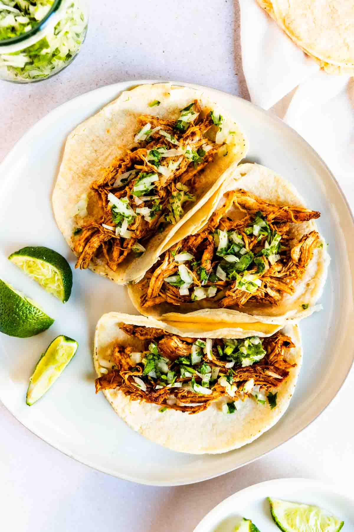 - Assemble the Tacos: Place a spoonful of shredded ancho‑chile chicken onto each warmed tortilla. Top with chopped cilantro, diced onion, and a squeeze of fresh lime juice. Add optional toppings like salsa, sour cream or avocado.