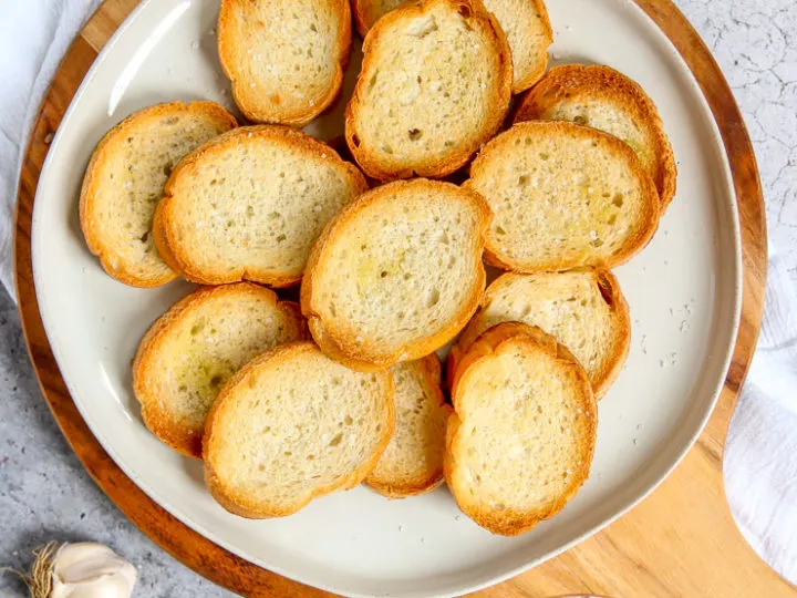Garlic Crostini is my personal favorite to serve with steamed garlic mussels to help soak up any of the broth that remains at the end.