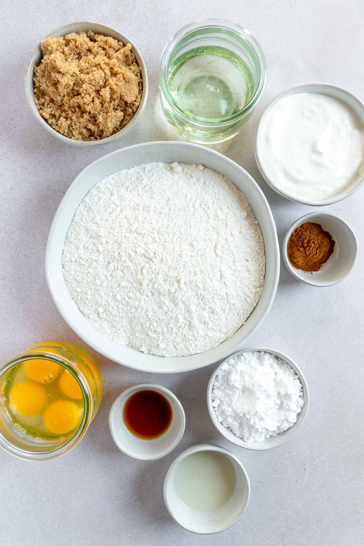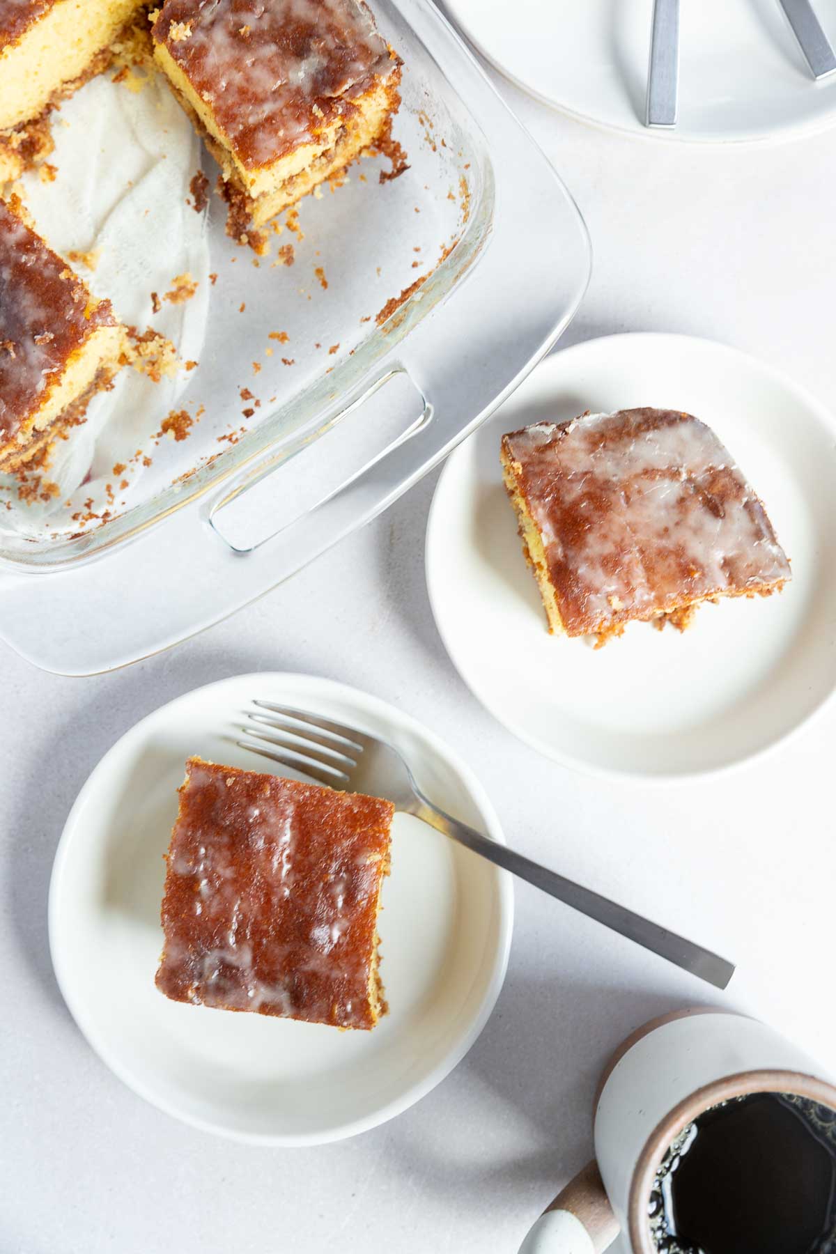 What makes this cake shine? That golden yellow cake base is impossibly moist (thank you, sour cream), while a gooey ripple of brown sugar and cinnamon runs through the middle like a hidden treasure. Then there’s the glaze which is silky, sweet, and so simple, it seeps into every forkful for the ultimate breakfast-meets-dessert mashup.