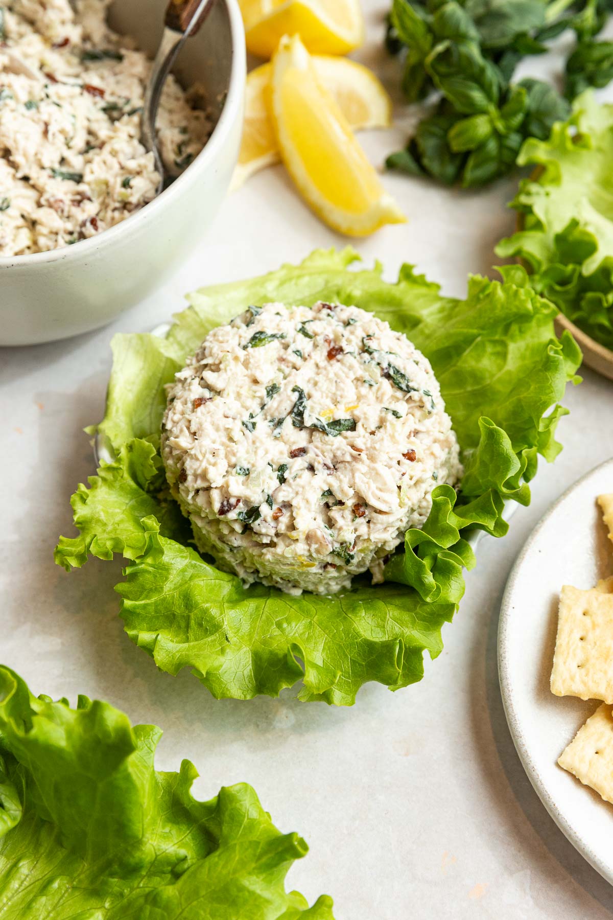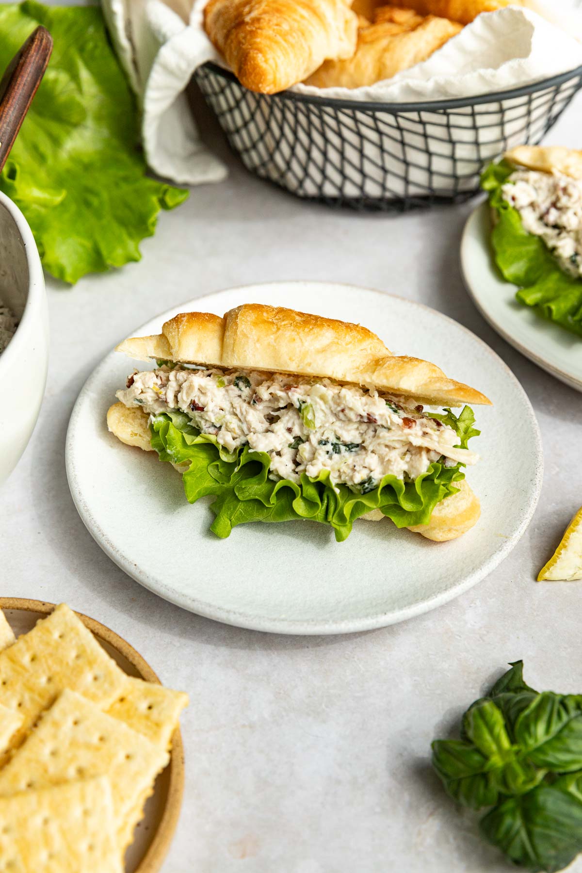- Garnish with extra basil. Serve on a bed of greens, in a sandwich, croissant, wrap, or with crackers.