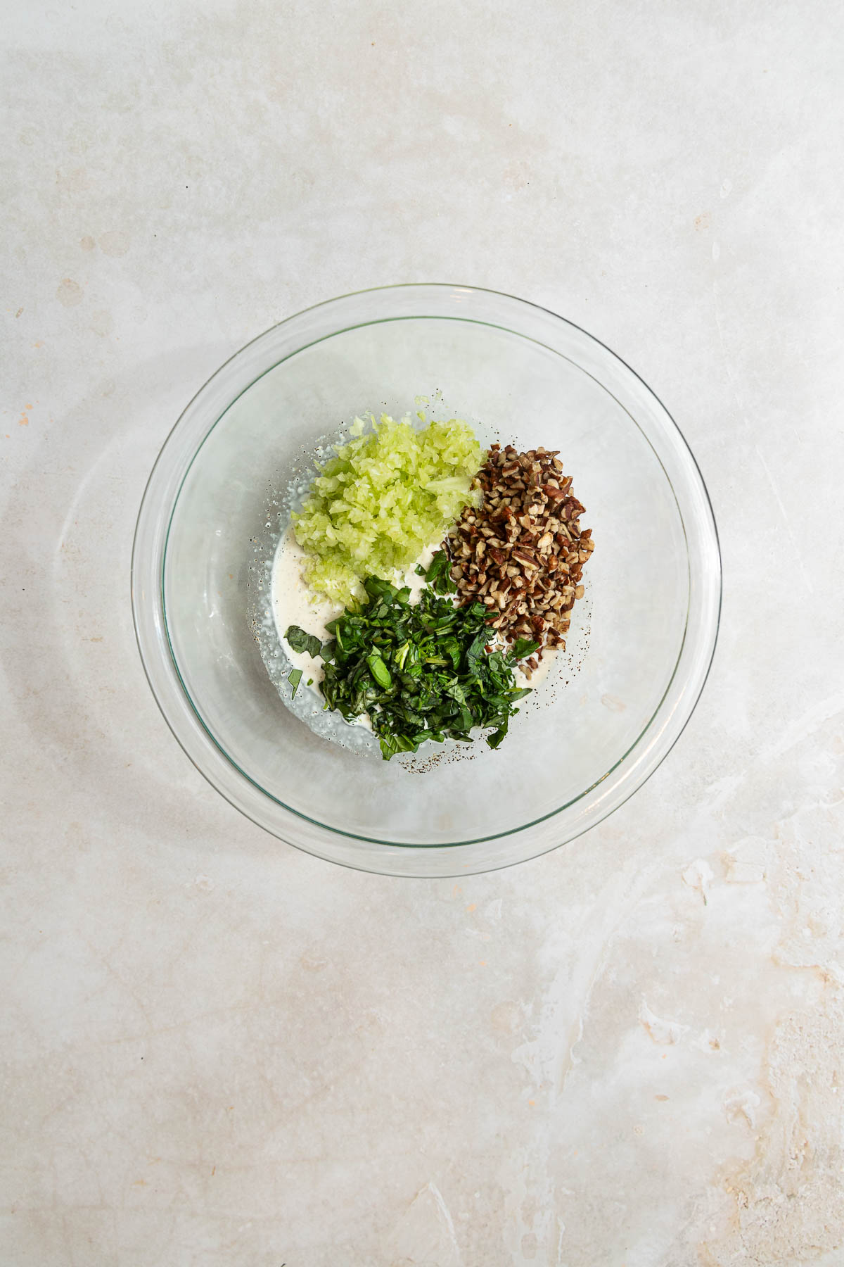 - Add chicken, basil, celery, and pecans to the bowl. Toss gently to coat everything evenly.