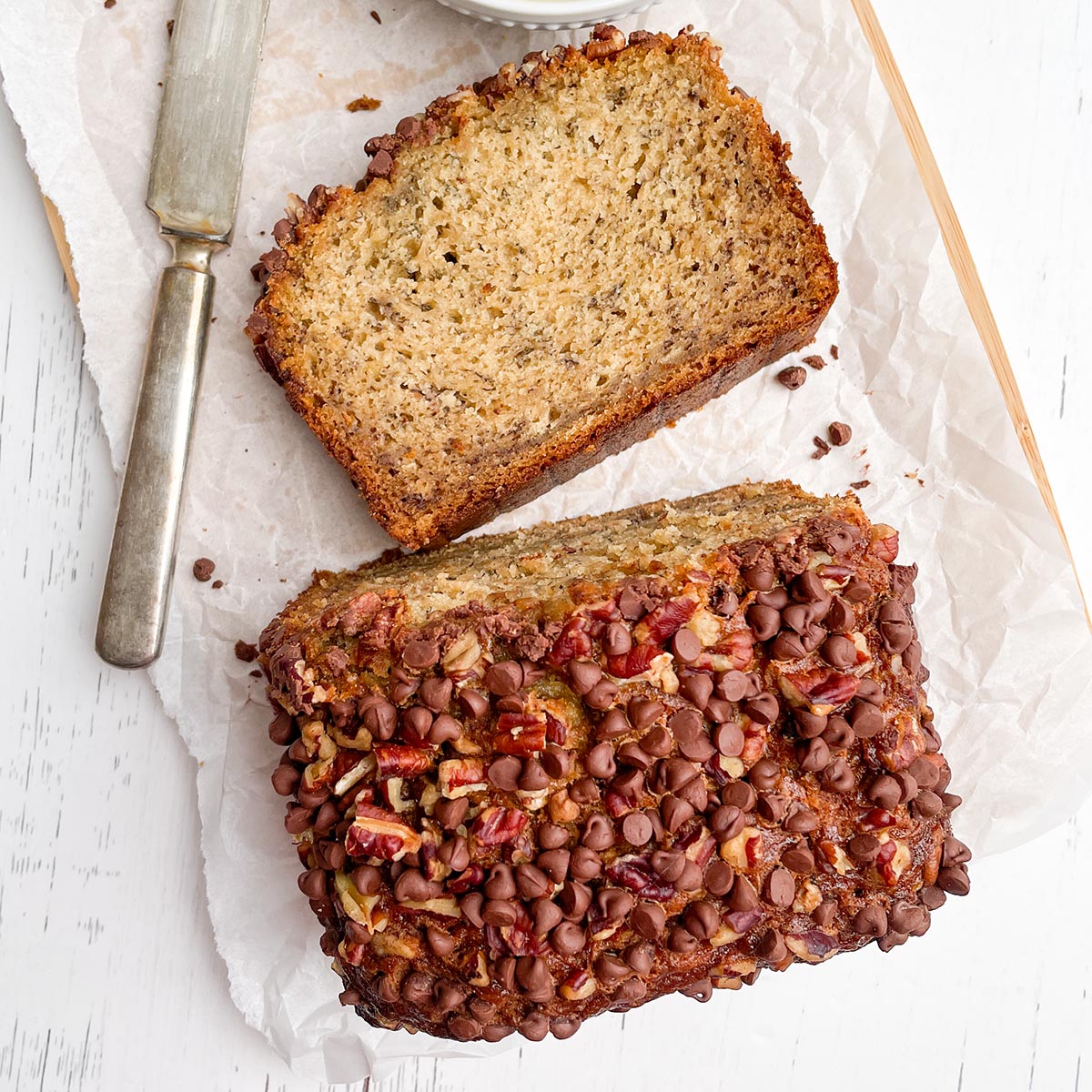 Banana bread is a staple and it's even better with chocolate chips and pecans!