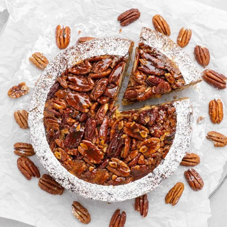 This Pecan Upside Down Cake is a vegan treat with a soft and moist caramelized nutty topping.